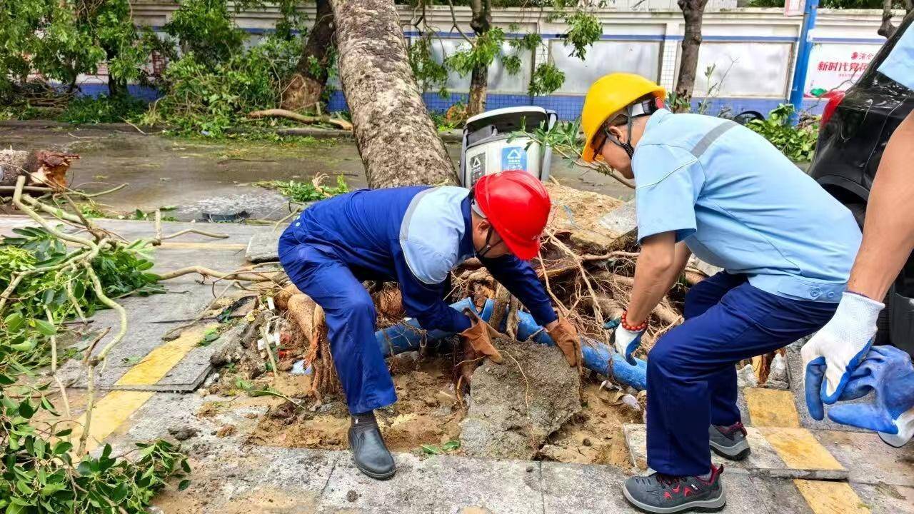 在湛江市霞山区工农路,多棵树木被连根拔起,沉重的树干砸断地下供水管道,导致周边7个小区、超4300户居民用水受到影响。