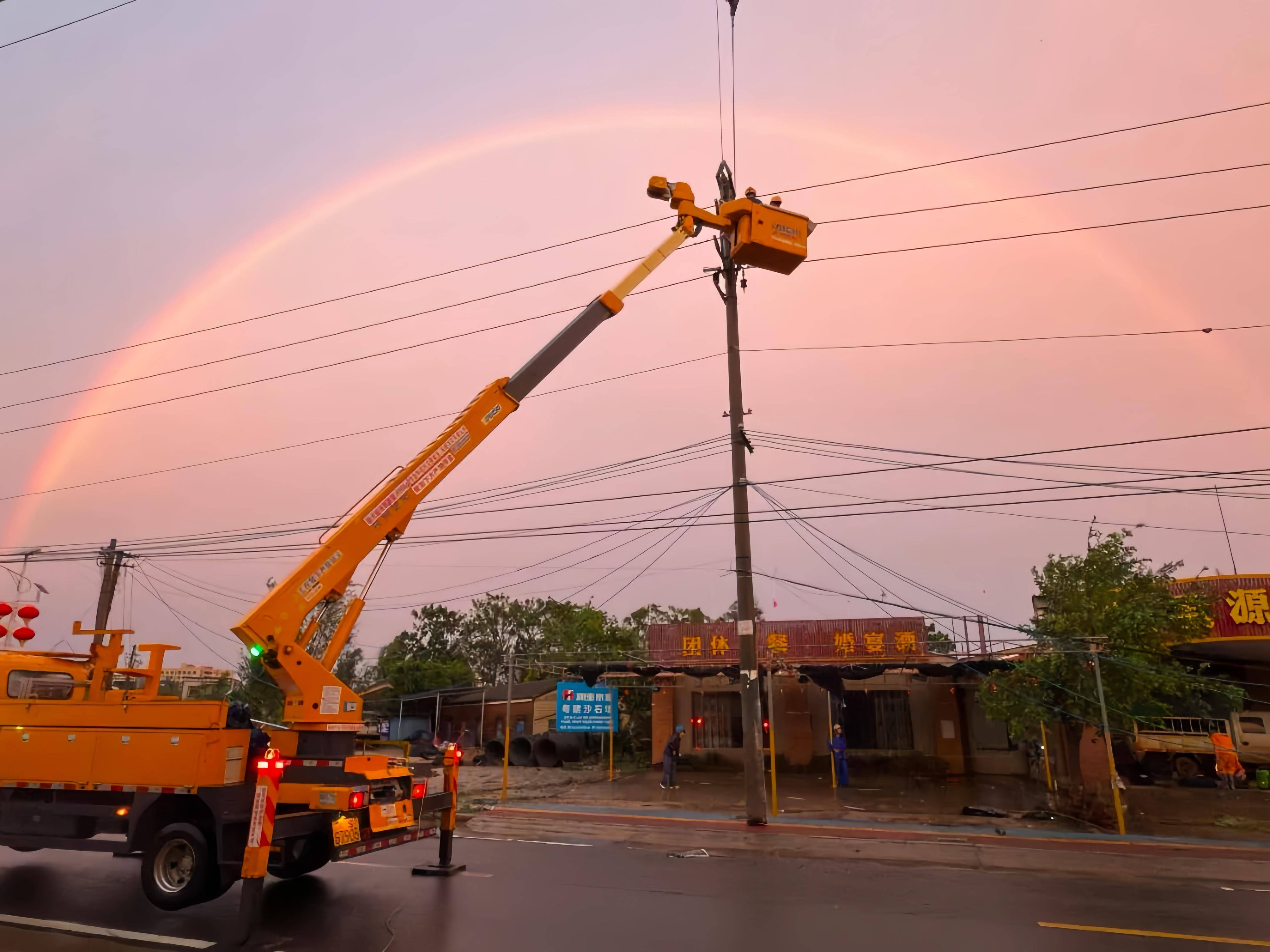 10月6日,抢修队完成徐闻县和安镇10千伏和墟线线路修复工作,一道彩虹横跨雨后晴空。