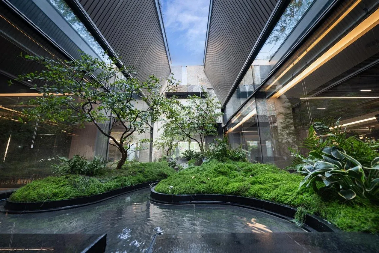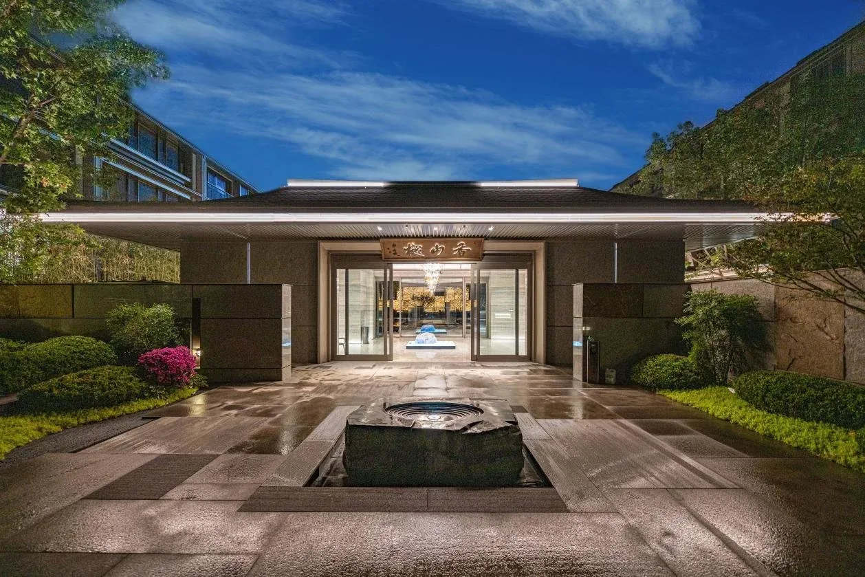 建筑屋顶以九脊歇山顶搭配龙鳞瓦,为中国古代皇家仕族规制,屋顶舒展于香山之中,与自然共融。研发团队耗时十月复刻汝瓷“似玉非玉而胜玉”的质感,将仿汝窑工艺应用于建筑立面,随天光变幻流淌青绿山水意境。